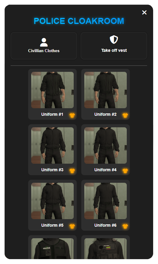 A minimal, modern clothing system built for ESX and QBCore β designed specifically for job-related outfits with full customization, bulletproof vest logic, and two UI modes.